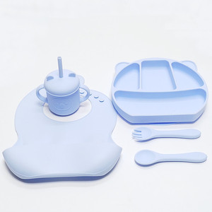 シーブルー (リトルベア 4 グリッドシリコンプレート + カップ + スタイ + フルシリコン + スプーン + フォーク)