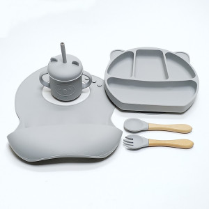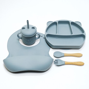 シルバーグレー (リトルベア 4 グリッドシリコンプレート + カップ + スタイ + 木製ハンドル + スプーン + フォーク)