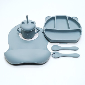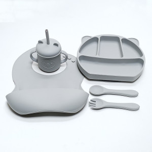 シルバーグレー (リトルベア 4 グリッドシリコンプレート + カップ + スタイ + フルシリコン + スプーン + フォーク)