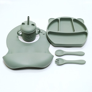 オリーブグリーン (リトルベア 4 グリッドシリコンプレート + カップ + スタイ + フルシリコン + スプーン + フォーク)