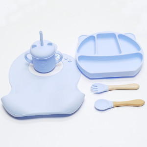 スカイブルー (リトルベア 4 グリッドシリコンプレート + カップ + スタイ + 木製ハンドル + スプーン + フォーク)