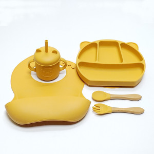 ライトブラウン(リトルベア 4グリッドシリコンプレート+カップ+よだれかけ+木製ハンドル+スプーン+フォーク)