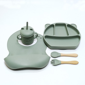 オリーブグリーン (リトルベア 4 グリッドシリコンプレート + カップ + スタイ + 木製ハンドル + スプーン + フォーク)