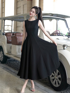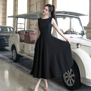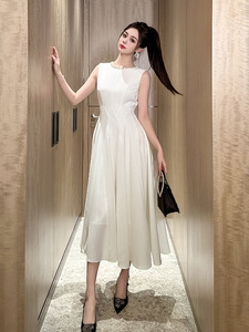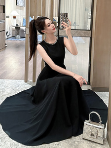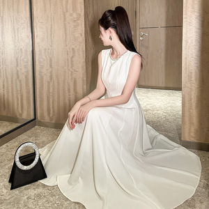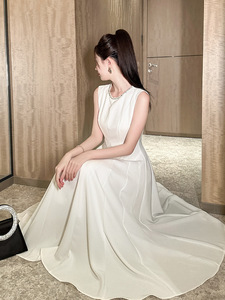 2025 新しい夏の女性のフレンチスタイルウエストと大きな裾のロングスカートシンプルな無地のノースリーブドレス 9779