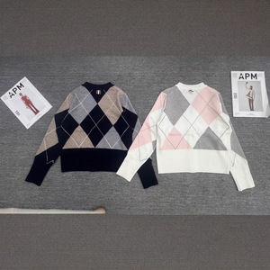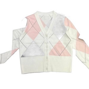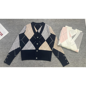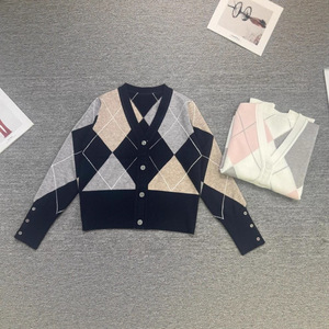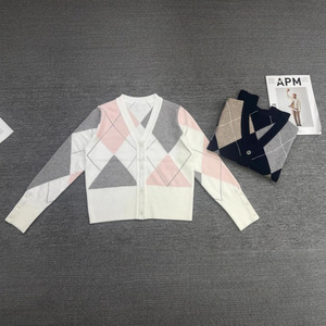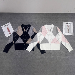 25年早秋新款彩色菱格针织撞色长袖单排扣V领开衫宽松百搭女毛衣