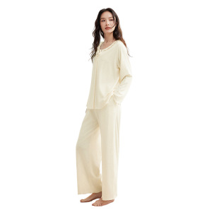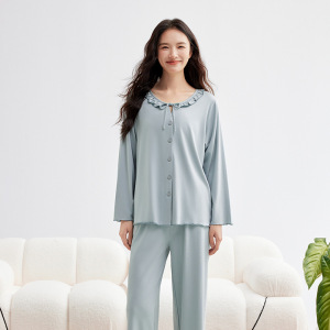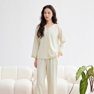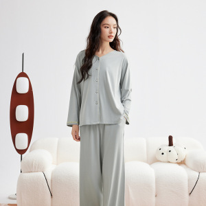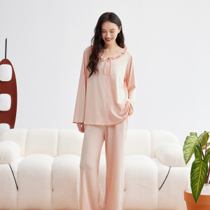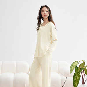 モダール綿薄手レディース秋無地長袖長ズボンセット春秋高級感レディースパジャマルームウェア