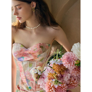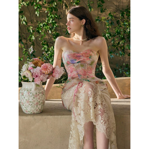 25新款外贸欧美法式甜美浪漫油画感蕾丝显瘦鱼骨胸衣半裙套装夏女