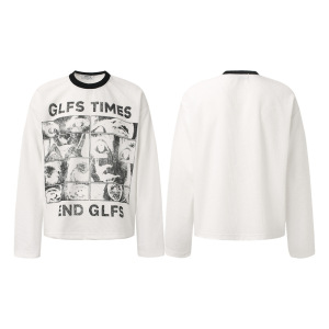 JW326美式复古街潮男女款高级感抽象图案设计男式华夫格长袖T恤