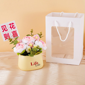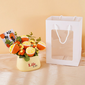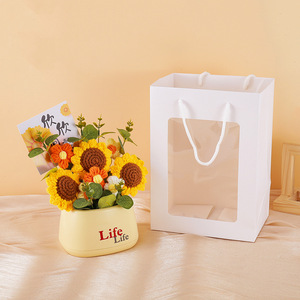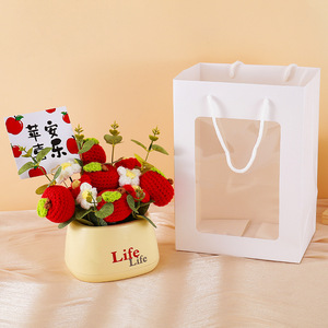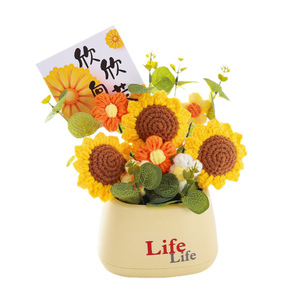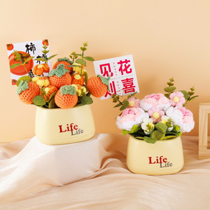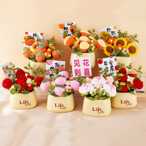完成した手織りのひまわりとイチゴの鉢植えの装飾品、模擬花、友人、母親、ガールフレンドへの誕生日プレゼントとして