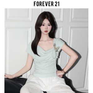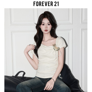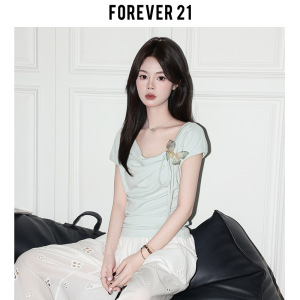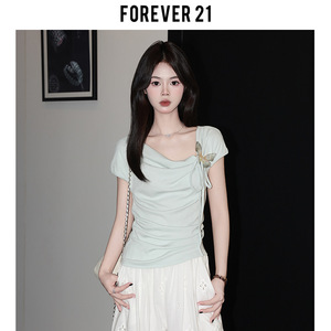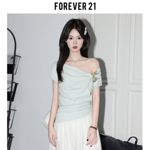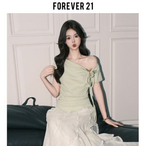 Forever21夏日独特浅蓝斜肩短袖T恤衫女氛围感蝴蝶结修身收腰上衣