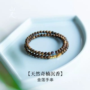 天然奇楠沉香手串双圈小米珠手链烧蓝莲花转运珠女新中式叠戴金莲