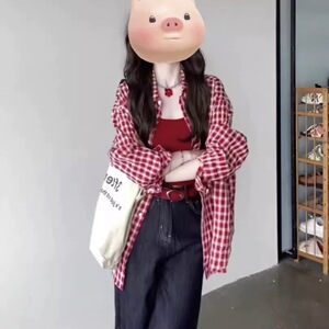 韩系复古红色格子衬衫外套女夏季新款松弛感休闲衬衣宽松防晒上衣