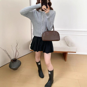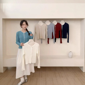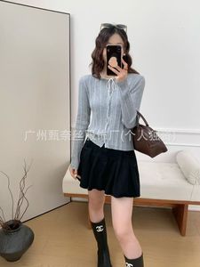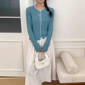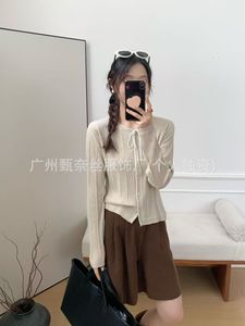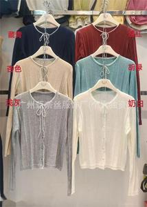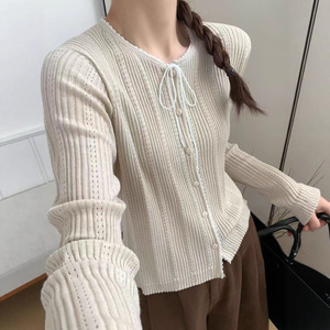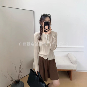 十三行2025早秋新款蝴蝶结系带镂空针织开衫女坑条修身显瘦毛衣