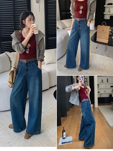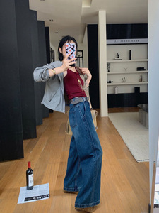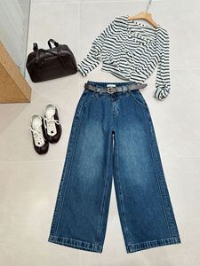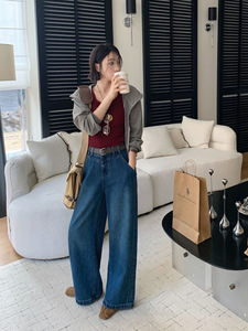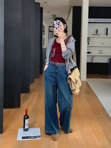 秋上新TOP欧制小个子裤型韩版侧边双压线阔腿裤牛仔裤配腰带82530