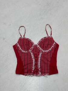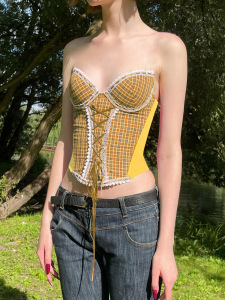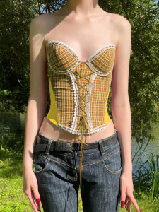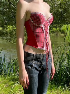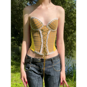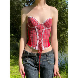 英国風甘辛チェック柄チューブトップ2025新作ロリータレースデザインベスト