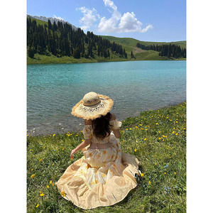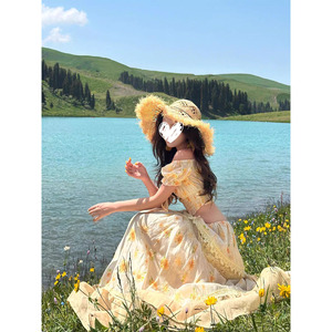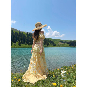 フレンチカジュアルリゾートスタイルイエロースーツレディースサマーチューブトップワンショルダートップハイウエストスリムスカート2点セット
