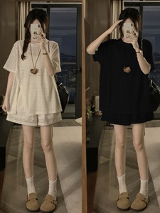 大码夏装夏季胖显瘦遮肉设计感镂空短袖恤上衣阔腿裤两件套装