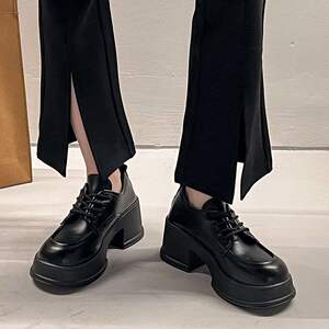 黑色厚底小皮鞋女款百搭粗跟玛丽珍鞋松糕圆头英伦高跟乐福鞋