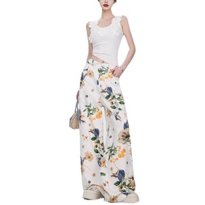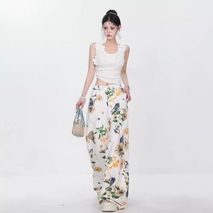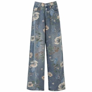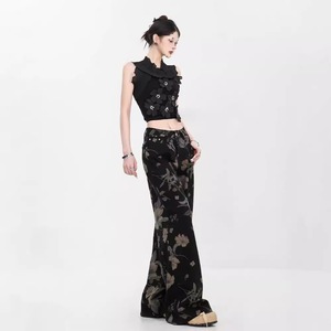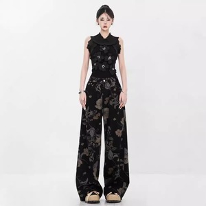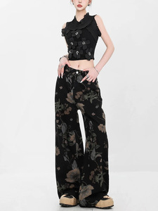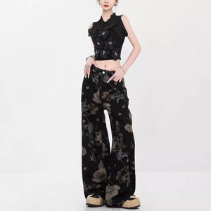 新中式印花阔腿牛仔裤女夏季新款设计感水洗黑色高腰直筒拖地长裤