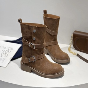 翻边两穿马丁靴女中靴新款圆头厚底中跟休闲皮带扣女中筒靴