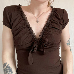法式复古蕾丝花边拼接V领短袖T恤蝴蝶结绑带胸型针织修身百搭上衣