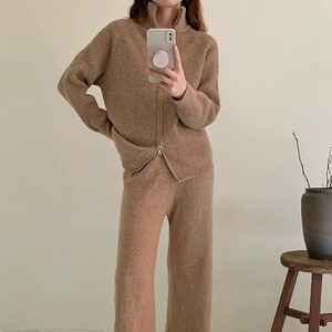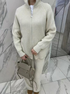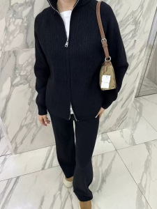 欧美针织拉链毛衣外套长裤套装Knitted zipper sweater pants set