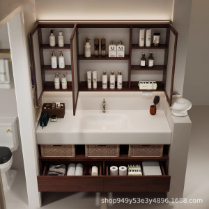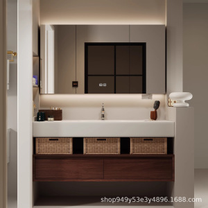 简约风浴室组合岩板热弯一体洗手脸台盆现代卫生间厕所实木洗漱盆