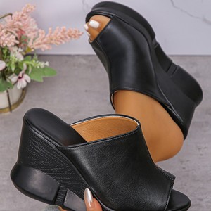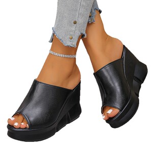 2025新款外贸坡跟拖鞋女夏季厚底松糕露趾一字凉拖鞋批发跨境wish