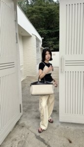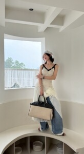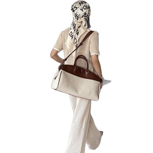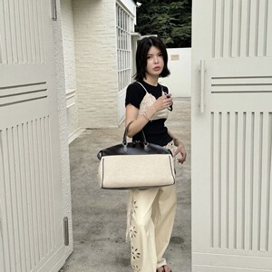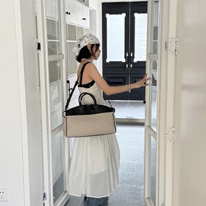 大容量波士顿手提包新款牛皮拼接帆布托特包法式休闲旅行保龄球包