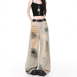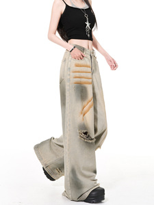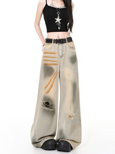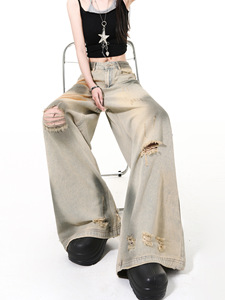 美式高街破洞阔腿牛仔裤男女25新款夏季宽松显瘦小众设计感直筒裤