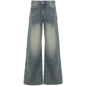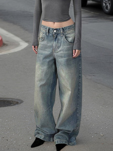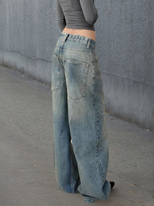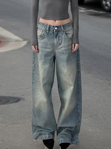 恋恋布忘新品女装秋冬复古做旧脏脏裤高腰直筒基础宽松阔腿牛仔裤