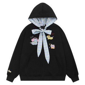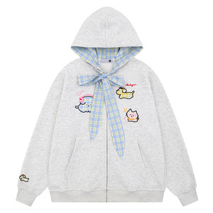 衣品男装美式狗狗刺绣格子连帽卫衣开衫女秋冬宽松慵懒风灰色外套