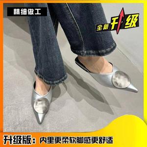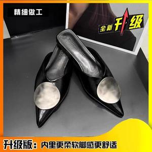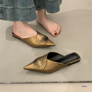 フレンチゴールドラウンドバックルポインテッドトゥソフトレザーフラットトゥハーフスリップサンダル女性用2025新しいレイジーミュールシューズ