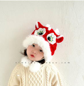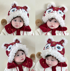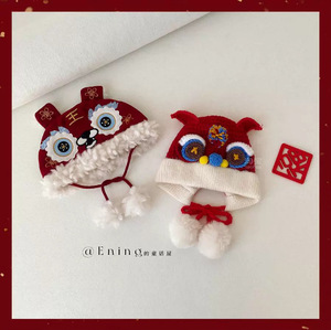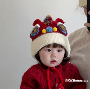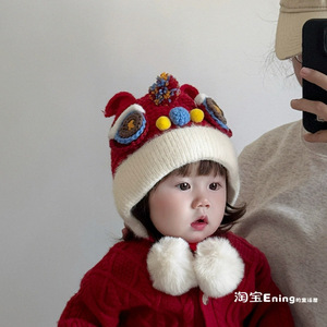 国风潮婴儿帽子2025秋冬季男女宝宝保暖加厚醒狮毛线帽新年虎头帽