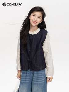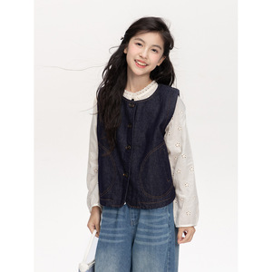 女童牛仔马甲2025秋季新款儿童复古圆领背心中大童休闲纯色上衣潮