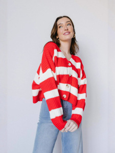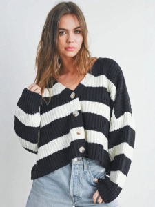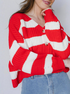 欧美跨境亚马逊秋冬新款女装休闲条纹长袖v领宽松针织开衫毛衣女