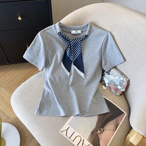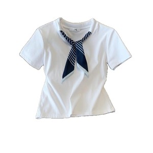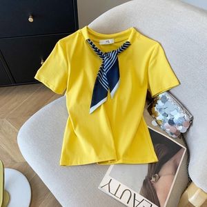 韩系时尚丝巾短袖t恤女夏季新款设计感翻领系带修身显瘦短款上衣