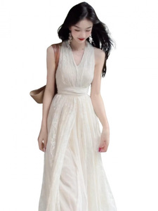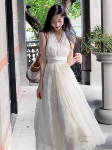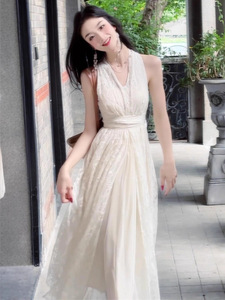 挂脖连衣裙女2025夏季新款高级感法式气质V领度假修身收腰长裙子