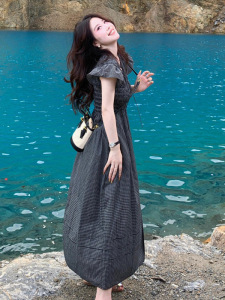 连衣裙女2025夏季新款高级感设计气质复古格子修身收腰短袖长裙子
