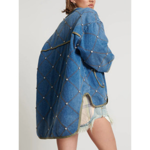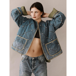 欧美跨境牛仔拼接绗缝订钻女秋季时尚保暖潮流轻质外套棉服MG600