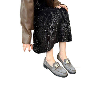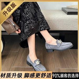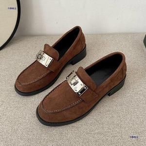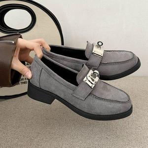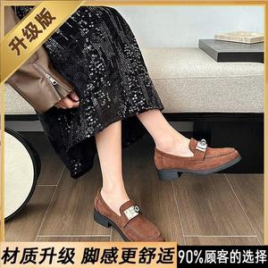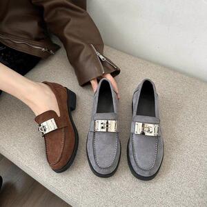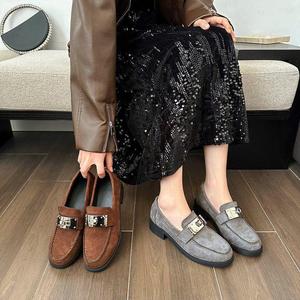新款磨砂羊翻皮金属扣棕色小皮鞋法式复古一脚蹬乐福鞋单鞋女秋冬