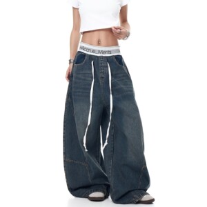 美式复古撞色腰头拼接弯刀牛仔裤男女新款设计感宽松休闲阔腿裤潮