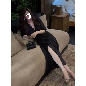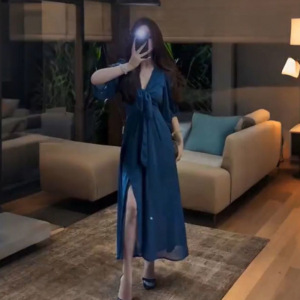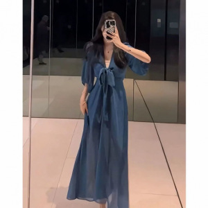 设计感绑带雪纺连衣裙女夏季新款下摆开衩法式气质V领长裙