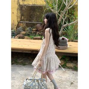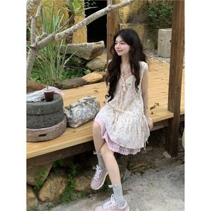 古着囡囡 日系清新奶油感内搭上衣+碎花抽绳背心吊带连衣裙套装