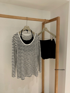 WGWE夏季女时尚休闲条纹薄款宽松长袖罩衫上衣背心两件套装W6599