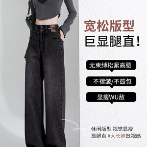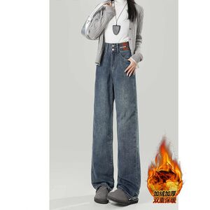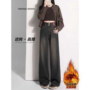 秋冬新款加绒加厚黑灰色阔腿牛仔裤女显瘦高腰大码窄版直筒长裤