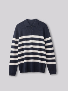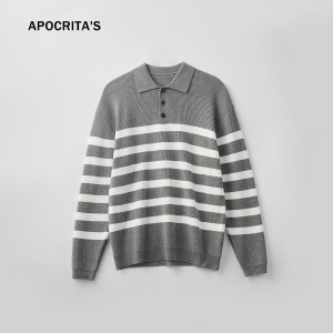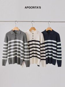 APO男装|跨境男士毛衣高级感宽松翻领撞色条纹POLO针织衫长袖上衣