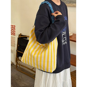 小众条纹帆布包女2025新款大容量单肩包慵懒风撞色文艺手提袋