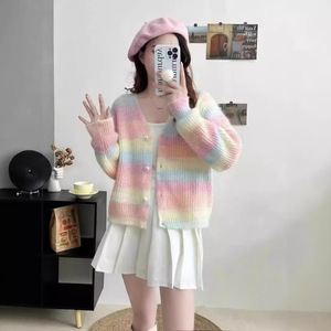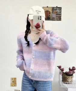 日系短款渐变色针织开衫外套女彩虹珍珠扣毛绒绒毛衣撞色设计