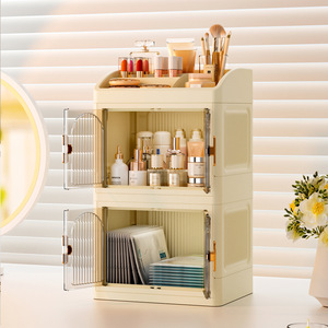 桌面折叠收纳盒防尘置物架家用双开门可叠加塑料口红首饰储物柜子